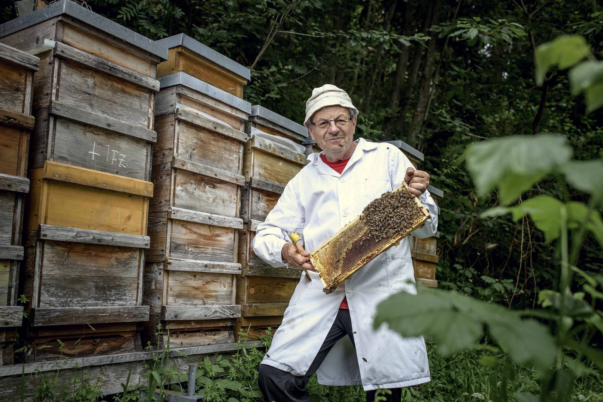 Erfahrung ist in der Imkerei viel wert. Auch wenn es darum geht, lästige Bienenstiche zu vermeiden, was der Imker aber akzeptiert: „Wir arbeiten ohne Schutzkleidung. Die Bienenrasse Carnica ist eher sanftmütig, auch wenn der eine oder andere Stich vorkommt.“ Schließlich erzeugen Bienen den Honig zur eigenen Nahrungsvorsorge aus dem Nektar von Blüten oder Honigtau. Sie nutzen ihn als Energie-Speicherquelle. Für Mensch und Tier ist die Zusammenarbeit heute von Vorteil: „Ohne Imker hätten wir in zwei Jahren keine Bienen mehr, denn die würden vom weit verbreiteten Varroabefall vernichtet.“ Ein Problem, das Schöpf seit seiner Zeit als Imker-Anfänger und in den darauffolgenden Ausbildungen zum Facharbeiter und Imkermeister begleitet. Der Qualitätsanspruch ist in dieser Zeit ebenfalls gewachsen: „Wir sind quasi ein Biobetrieb – ich bin nur bei keinem Verband dabei. Ich muss aber für meine größeren Abnehmer meinen Honig zur Pollenanalyse einsenden, da Zertifikate verlangt werden. Denn wenn ich ihn mit Alpenrosenhonig kennzeichne, muss per Definition mindestens 51 Prozent Alpenrosenpollenanteil im Honig sein. Was in der Regel aber ohnedies viel mehr ist.“ Die zahlreichen Auszeichnungen für den Honig von Walter Schöpf bezeugen die hohe Qualität, sehr zur Freude aller Naschkatzen.