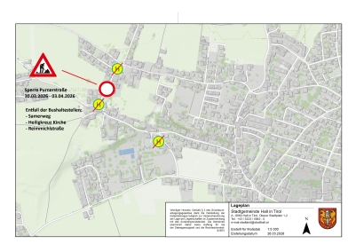 Wegen dem Ausbau der Infrastruktur und den damit notwendigerweise verbundenen Grabungsarbeiten wird die Purnerstraße in Heiligkreuz/Hall in Tirol von 30. März bis 3. April 2026 gesperrt.
